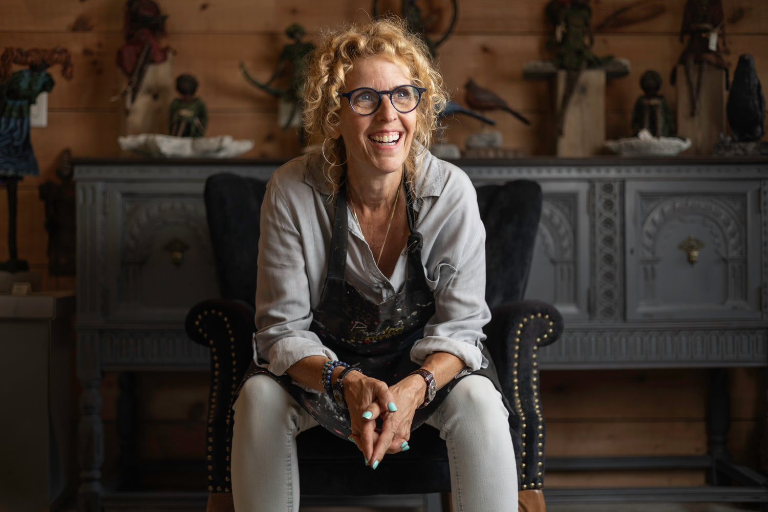 Now I’m finding the more workshops I do, the more I see people finding the same paths. The vibes from the studio, the greetings of my happy dogs, the music, laughter, dancing, food and friendships deepened during the workshop sessions just enhance the art therapy. I’ve found (personally and in talking with my artists) that it’s more important to give yourself the freedom to express what’s inside you. That’s truly what art is about.